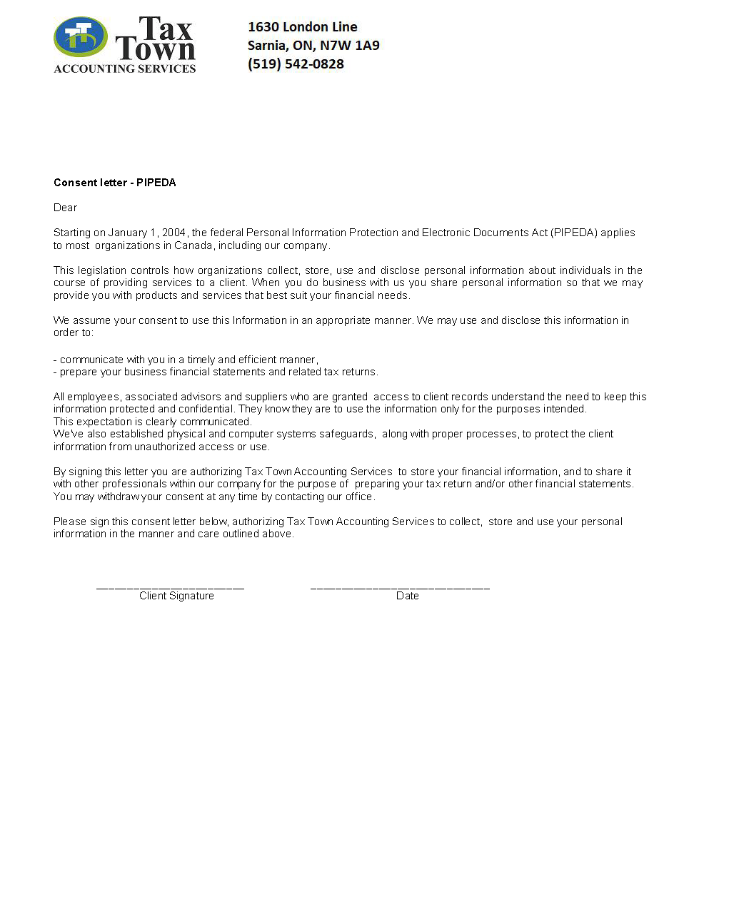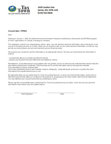 PIPEDA Consent Form: Authorizing the collection, use, and disclosure of your personal information as required for tax preparation and related services (if applicable).